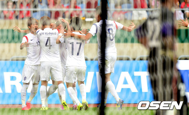 14일 오후 인천 문학경기장에서 열린 2014 인천 아시안게임 남자 축구 A조 조별리그 1차전 한국과 말레이시아의 경기 전반 임창우가 골을 넣고 동료들과 기쁨을 나누고 있다.