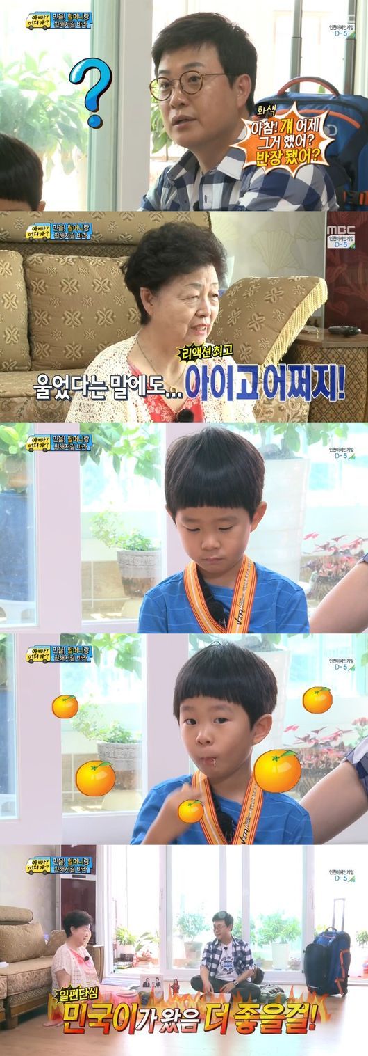 김민율은 14일 방송된 MBC 예능프로그램 ‘일밤-아빠 어디가’에서 아빠 김성주와 함께 친할머니 집에 갔다.