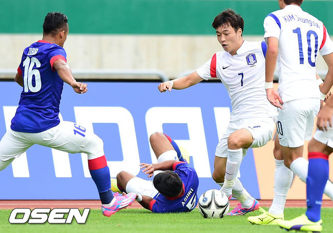 14일 오후 인천 문학경기장에서 열린 2014 인천 아시안게임 남자 축구 A조 조별리그 1차전 한국과 말레이시아의 경기 전반 안용우가 문전 돌파를 시도하고 있다.