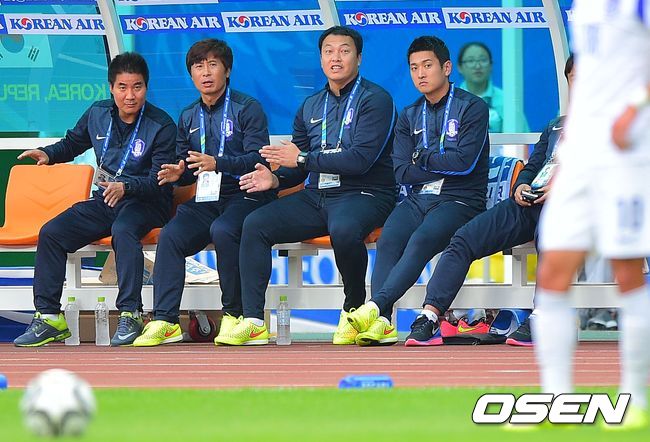 14일 오후 인천 문학경기장에서 열린 2014 인천 아시안게임 남자 축구 A조 조별리그 1차전 한국과 말레이시아의 경기 전반 김승대의 프리킥때 이운재 코치가 작전 지시를 하고 있다