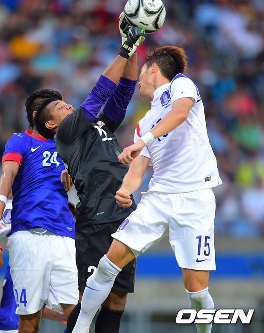 14일 오후 인천 문학경기장에서 열린 2014 인천 아시안게임 남자 축구 A조 조별리그 1차전 한국과 말레이시아의 경기 후반 임창우가 헤딩슛을 시도하고 있다.