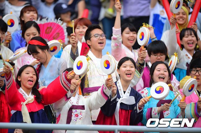 14일 오후 인천 문학경기장에서 열린 2014 인천 아시안게임 남자 축구 A조 조별리그 1차전 한국과 말레이시아의 경기 한복 차려입은 축구팬들이 열띤 응원을 하고 있다