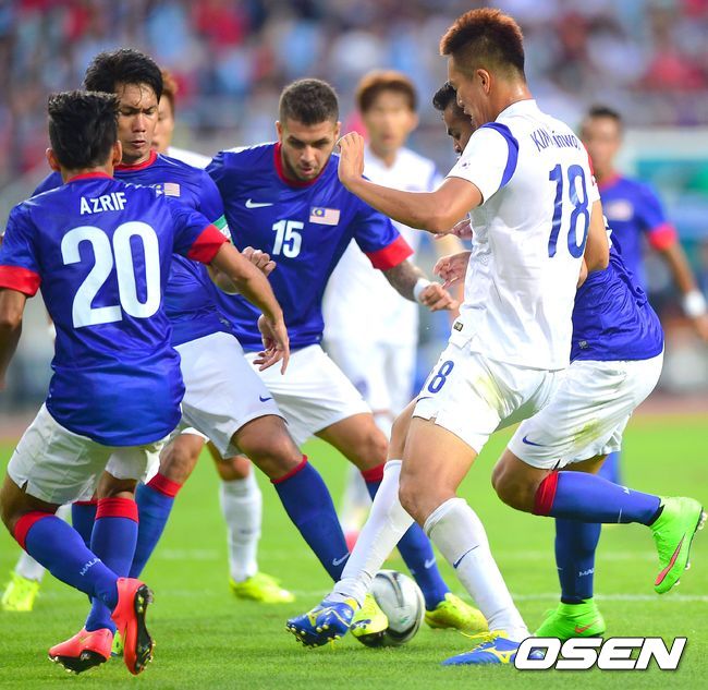 14일 오후 인천 문학경기장에서 열린 2014 인천 아시안게임 남자 축구 A조 조별리그 1차전 한국과 말레이시아의 경기 후반 김신욱이 말레이시아 수비에 막히고 있다