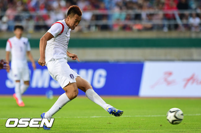 14일 오후 인천 문학경기장에서 열린 2014 인천 아시안게임 남자 축구 A조 조별리그 1차전 한국과 말레이시아의 경기 후반 김신욱이 골을 넣고 있다.
