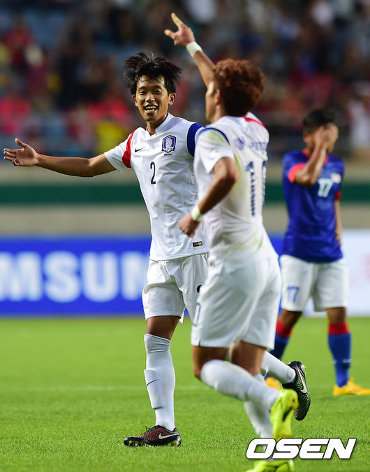 14일 오후 인천 문학경기장에서 열린 2014 인천 아시안게임 남자 축구 A조 조별리그 1차전 한국과 말레이시아의 경기 후반 김승대가 골을 넣고 벤치 쪽으로 달려가고 있다.