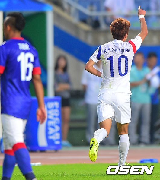 14일 오후 인천 문학경기장에서 열린 2014 인천 아시안게임 남자 축구 A조 조별리그 1차전 한국과 말레이시아의 경기 후반 김승대가 추가골을 넣고 환호하고 있다