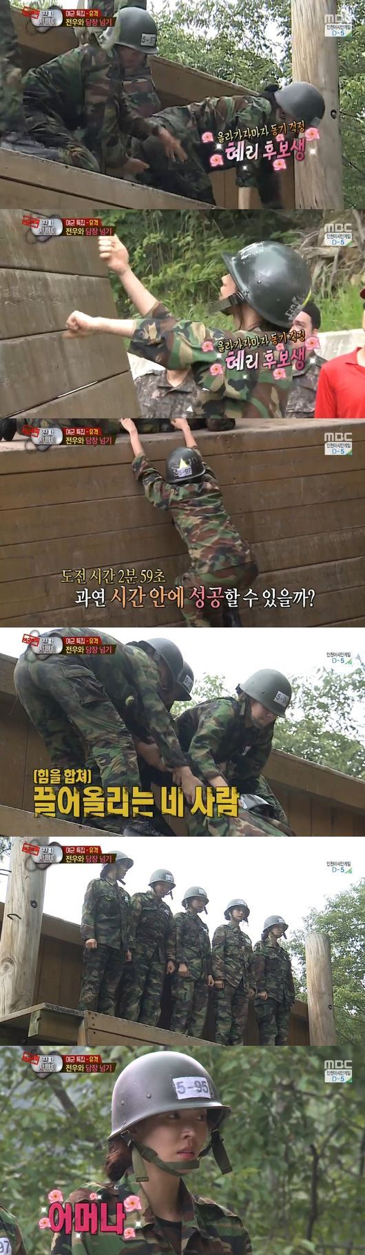 서로의 몸에 기대 발을 미는 과정은 이들의 전우애가 느껴져서 감동적이었다. 최약체 김소연이 담장을 넘기까지 많은 동료들이 고생했고, 마지막 혜리가 담장을 넘는 순간 모두들 울컥해 했다. 그리고 이들은 모두 성공하며 훈련을 마쳤다.