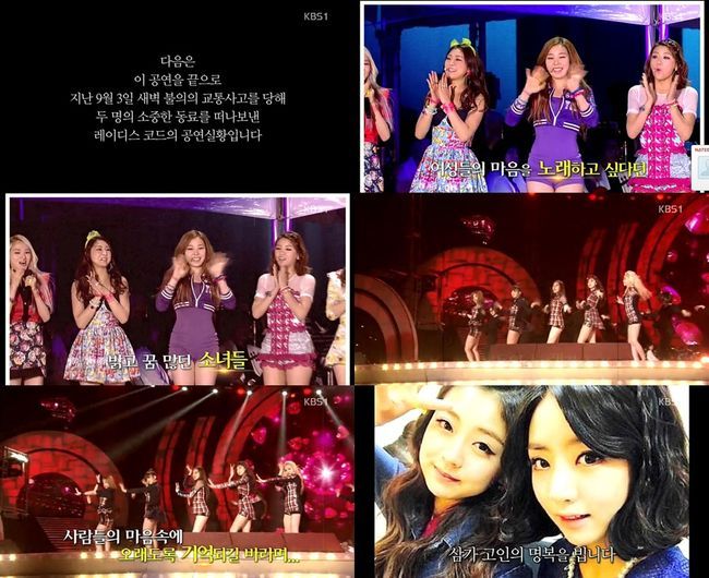 이날 방송에서 가장 마지막으로 전파를 탄 레이디스 코드 무대에 앞서 '열린 음악회' 측은 "다음은 이 공연을 끝으로 지난 9월 3일 새벽 불의의 교통사고를 당해 두 명의 소중한 동료를 떠나보낸 레이디스 코드의 공연 실황입니다"라는 문구를 내보냈다.