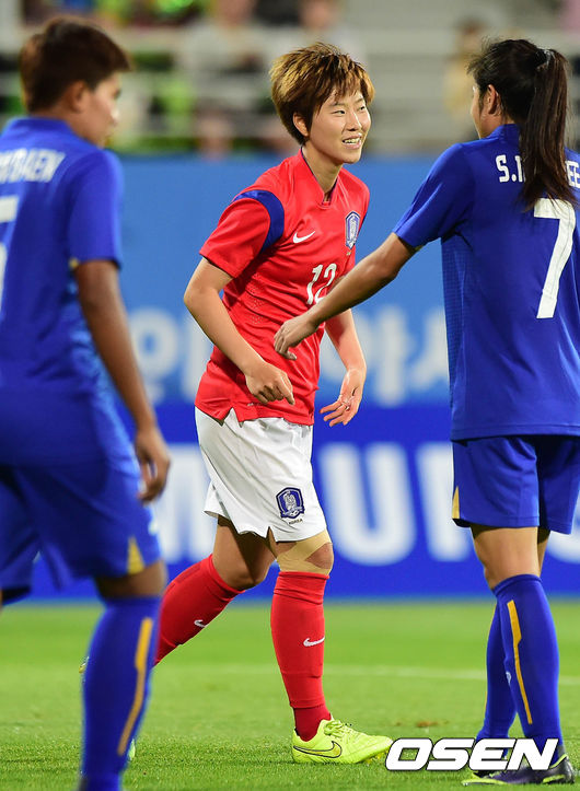 14일 오후 인천 남동 럭비경기장에서 열린 2014 인천 아시안게임 여자 축구 A조 1차전 한국과 태국의 경기 후반 유영아가 골을 넣고 미소를 짓고 있다.