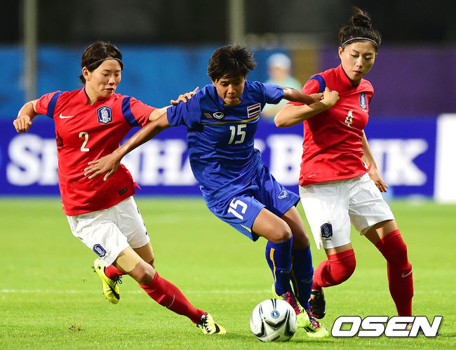 14일 오후 인천 남동 럭비경기장에서 열린 2014 인천 아시안게임 여자 축구 A조 1차전 한국과 태국의 경기 후반 송수란과 심서연이 수비를 펼치고 있다.