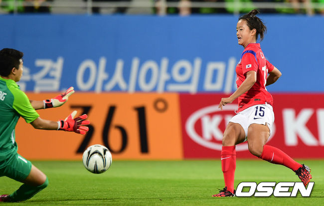 14일 오후 인천 남동 럭비경기장에서 열린 2014 인천 아시안게임 여자 축구 A조 1차전 한국과 태국의 경기 후반 최유리가 골을 넣고 있다.