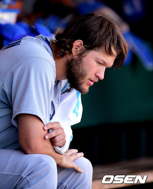 15일(이하 한국시간) 미국 캘리포니아주 샌프란시스코 AT&T 파크에서 열린 '2014 메이저리그' LA 다저스와 샌프란시스코 자이언츠의 경기, 다저스 선발 커쇼가 더그아웃에서 경기를 준비하고 있다.