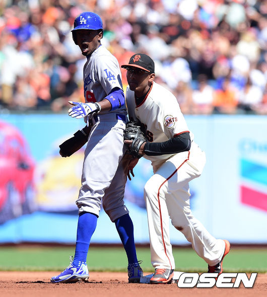 15일(이하 한국시간) 미국 캘리포니아주 샌프란시스코 AT&T 파크에서 열린 '2014 메이저리그' LA 다저스와 샌프란시스코 자이언츠의 경기, 1회초 무사 1루에서 다저스 고든이 2루에서 견제 아웃을 당하고 아쉬워하고 있다. 하지만 비디오 판독 요청 결과 세이프로 번복.
