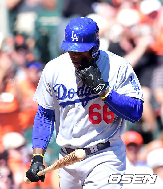 15일(이하 한국시간) 미국 캘리포니아주 샌프란시스코 AT&T 파크에서 열린 '2014 메이저리그' LA 다저스와 샌프란시스코 자이언츠의 경기, 1회초 무사 1루에서 다저스 푸이그가 삼진으로 물러나고 있다.