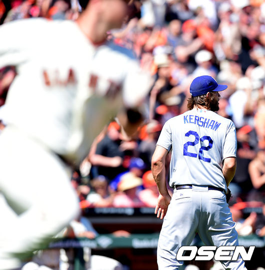 15일(이하 한국시간) 미국 캘리포니아주 샌프란시스코 AT&T 파크에서 열린 '2014 메이저리그' LA 다저스와 샌프란시스코 자이언츠의 경기, 3회말 2사 1,2루에서 다저스 커쇼가 샌프란시스코 포지에 1타점 좌전 적시타를 허용하며 아쉬워하고 있다. 포지는 2루에서 아웃되며 이닝 종료.