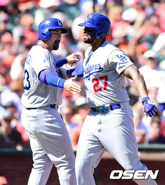 15일(이하 한국시간) 미국 캘리포니아주 샌프란시스코 AT&T 파크에서 열린 '2014 메이저리그' LA 다저스와 샌프란시스코 자이언츠의 경기, 6회초 1사 2루에서 다저스 맷 켐프가 투런포를 날리고 곤잘레스와 기뻐하고 있다.