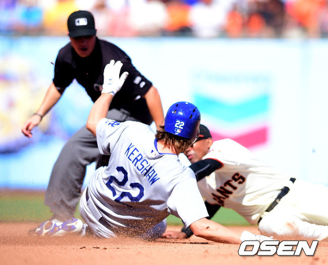 15일(이하 한국시간) 미국 캘리포니아주 샌프란시스코 AT&T 파크에서 열린 '2014 메이저리그' LA 다저스와 샌프란시스코 자이언츠의 경기, 7회초 2사에서 다저스 커쇼가 안타를 날리고 2루에서 태그아웃 당하고 있다.