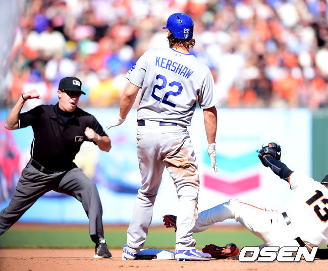 15일(이하 한국시간) 미국 캘리포니아주 샌프란시스코 AT&T 파크에서 열린 '2014 메이저리그' LA 다저스와 샌프란시스코 자이언츠의 경기, 7회초 2사에서 다저스 커쇼가 안타를 날리고 2루에서 태그아웃 당하고 있다.