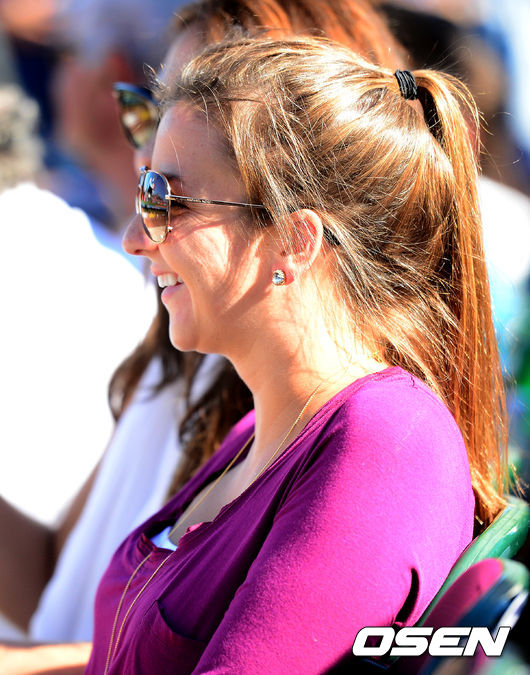 다저스 커쇼의 아내 앨렌 커쇼가 경기를 지켜보며 미소짓고 있다./jpnews@osen.co.kr