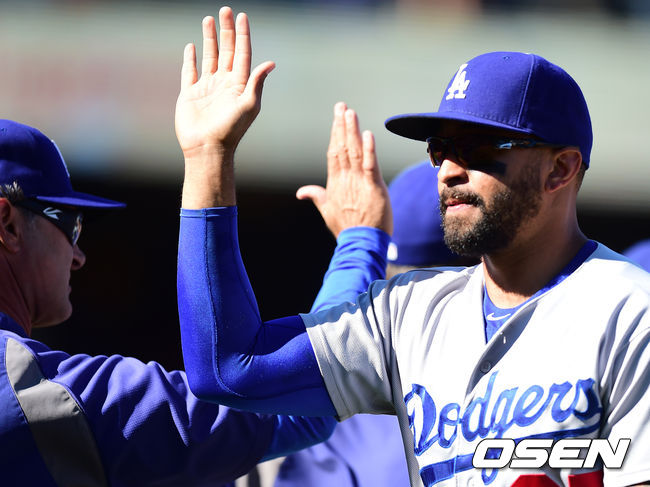 경기후 다저스 맷 켐프가 매팅리 감독과 하이파이브를 하고 있다./jpnews@osen.co.kr