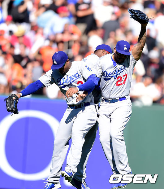다저스 크로포드, 푸이그, 맷 켐프가 승리 세리머니를 하고 있다./jpnews@osen.co.kr