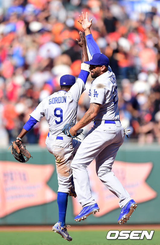 경기후 다저스 고든, 맷 켐프가 승리 세리머니를 하고 있다./jpnews@osen.co.kr