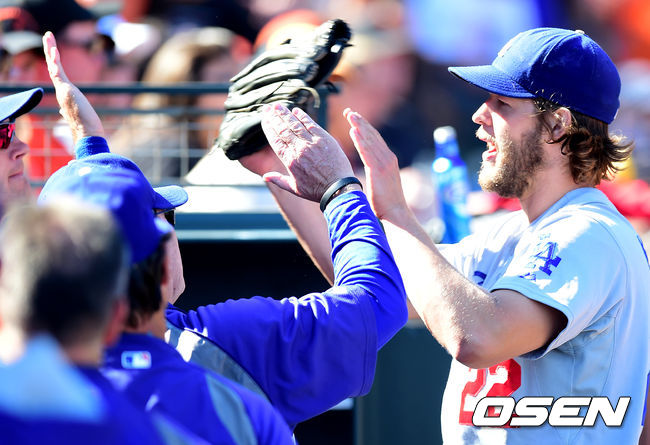 8회초 수비를 마친 다저스 커쇼가 더그아웃에서 하이파이브를 하고 있다./jpnews@osen.co.kr