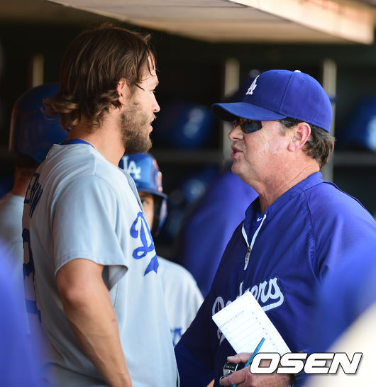8회초 수비를 마친 다저스 커쇼가 더그아웃에서 허니컷 코치와 이야기를 나누고 있다./jpnews@osen.co.kr