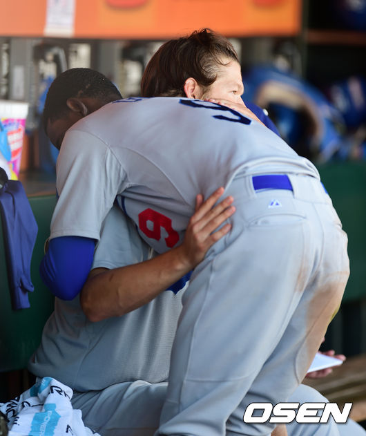 7회말 수비를 마치고 다저스 고든이 커쇼에 미안함을 표하고 있다. 고든은 7회말 2사 1,2루에서 샌프란시스코 더피의 중전 안타를 쫓다 아쉽게 놓치고 실점을 허용했다./jpnews@osen.co.kr