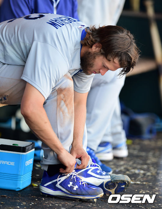 8회말 수비를 마치고 다저스 커쇼가 스파이크 끈을 풀고 있다./jpnews@osen.co.kr