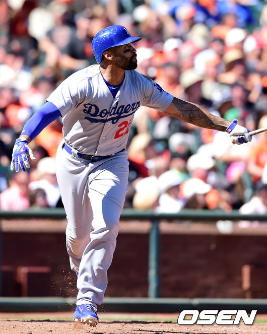 6회초 1사 2루에서 다저스 맷 켐프가 투런포를 날리며 타구를 바라보고 있다./jpnews@osen.co.kr