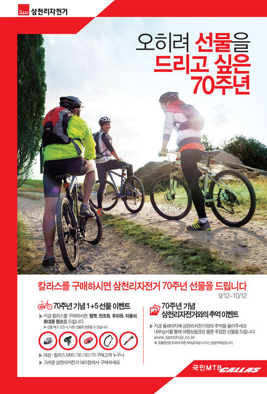 MTB 칼라스를 구매하는 이들에게 사은품을 주고, 네이버 커뮤니티와 제휴해 삼천리자전거와의 추억 공유 이벤트를 진행한다.