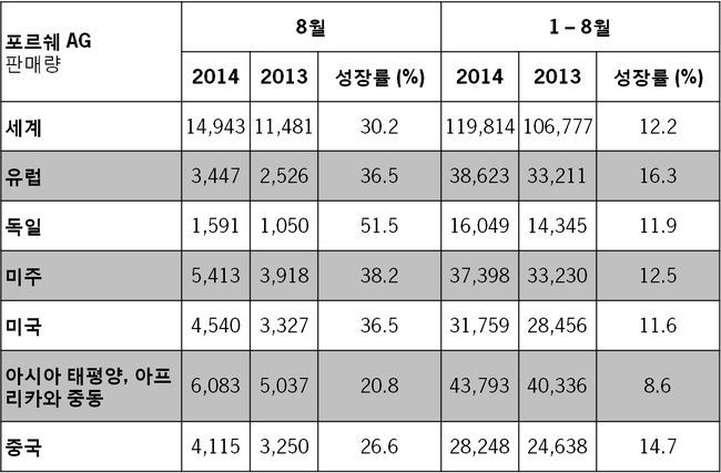 스투트가르트에 본사를 두고 있는 포르쉐는 2014년 1월부터 8월까지 전 세계 12만 대의 판매량을 기록하며 작년 동기 대비 12% 증가한 판매 성장률을 보였다. 포르쉐 AG는 8월 한달 간 전년 동월 대비 30% 증가한 수치인 1만 5000대를 판매했다.