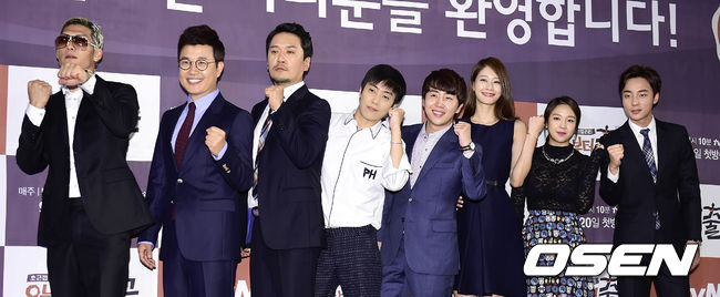 15일 오후 서울 여의도 63컨벤션센터에서 열린 케이블채널 tvN 새 예능 프로그램 '오늘부터 출근' 제작발표회에서 출연자들이 파이팅을 외치고 있다.