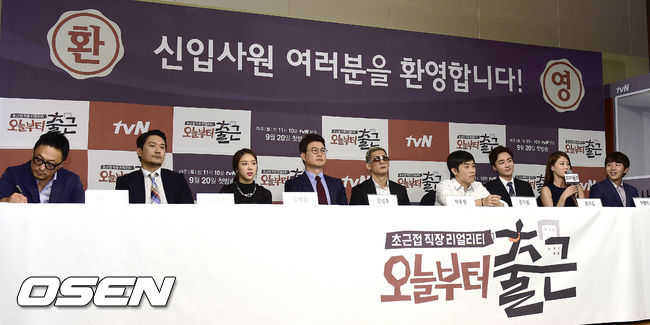 15일 오후 서울 여의도 63컨벤션센터에서 열린 케이블채널 tvN 새 예능 프로그램 '오늘부터 출근' 제작발표회에서 고민구PD와 출연자들이 자리하고 있다.