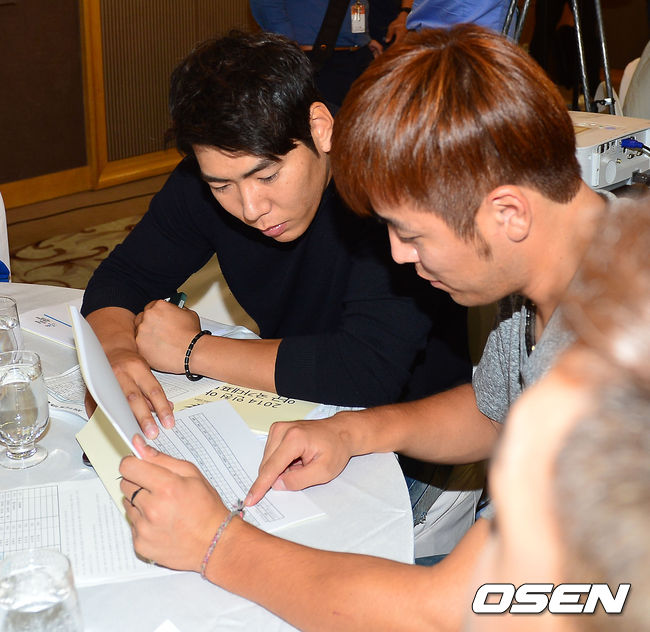 15일 오후 서울 리베라호텔 15층 로즈홀에서 AG 야구대표팀 류중일 감독과 박병호 김광현이 기자회견을 가졌다. 기자회견 후 열린 AG 야구대표팀 소청교육에서 강정호와 강민호가 교육자료를 보며 얘기를 나누고 있다.