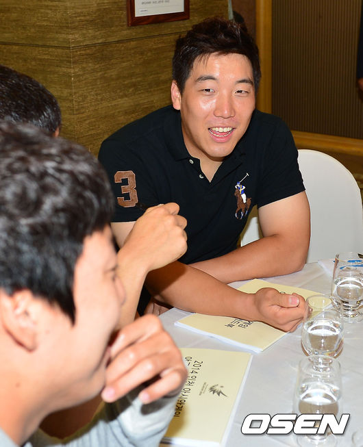 15일 오후 서울 리베라호텔 15층 로즈홀에서 AG 야구대표팀 류중일 감독과 박병호 김광현이 기자회견을 가졌다. 기자회견 후 열린 AG 야구대표팀 소청교육에서 김현수가 얘기를 나누며 환하게 웃고 있다.