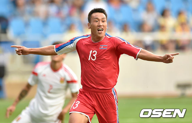 전반 북한 심현진이 선제골을 성공시키고 환호하고 있다.
