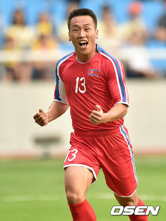 전반 북한 심현진이 선제골을 성공시키고 환호하고 있다.