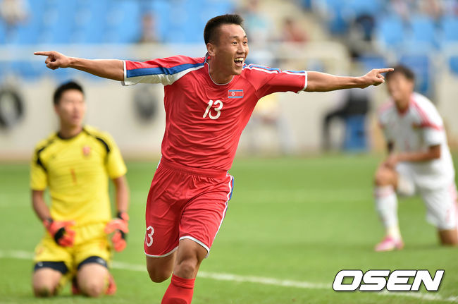 전반 북한 심현진이 선제골을 성공시키고 환호하고 있다.