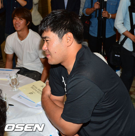 15일 오후 서울 리베라호텔 15층 로즈홀에서 AG 야구대표팀 류중일 감독과 박병호 김광현이 기자회견을 가졌다. 기자회견 후 열린 AG 야구대표팀 소청교육에서 이재원이 환하게 웃고 있다.