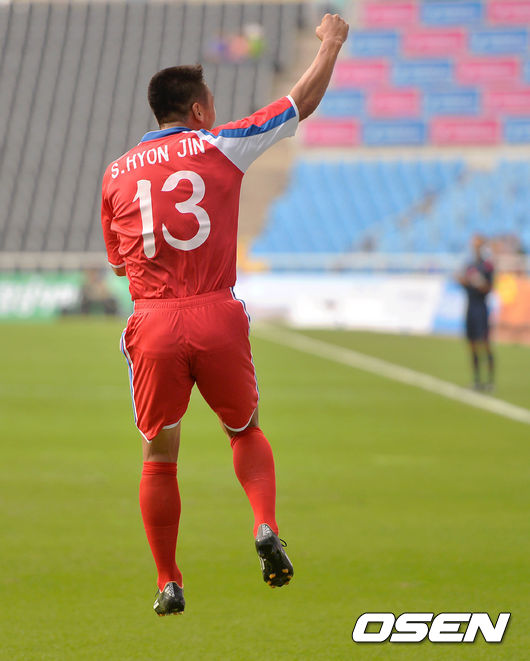 전반 북한 심현진이 선제골을 성공시키고 환호하고 있다.