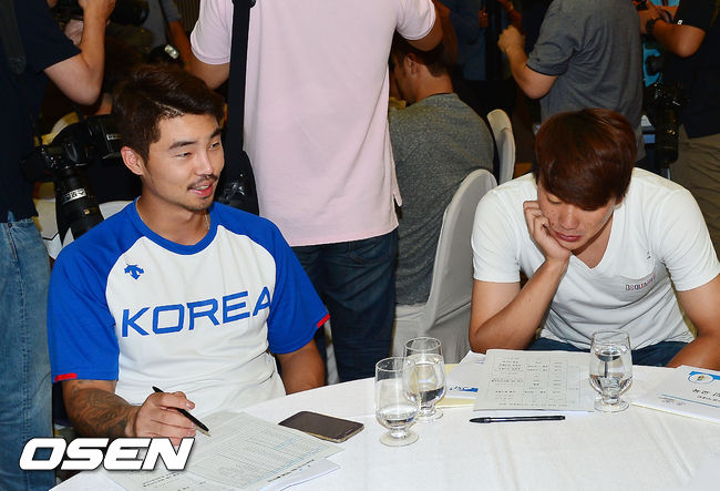 15일 오후 서울 리베라호텔 15층 로즈홀에서 AG 야구대표팀 류중일 감독과 박병호 김광현이 기자회견을 가졌다. 기자회견 후 열린 AG 야구대표팀 소청교육에서 오재원과 김광현이 말을 하고 있다.