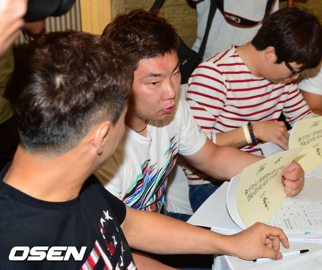 15일 오후 서울 리베라호텔 15층 로즈홀에서 AG 야구대표팀 류중일 감독과 박병호 김광현이 기자회견을 가졌다. 기자회견 후 열린 AG 야구대표팀 소청교육에서 손아섭과 나지완이 얘기를 나누고 있다.