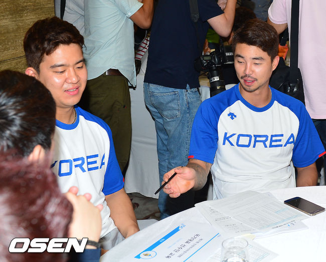 15일 오후 서울 리베라호텔 15층 로즈홀에서 AG 야구대표팀 류중일 감독과 박병호 김광현이 기자회견을 가졌다. 기자회견 후 열린 AG 야구대표팀 소청교육에서 오재원과 김민성이 얘기를 나누고 있다.