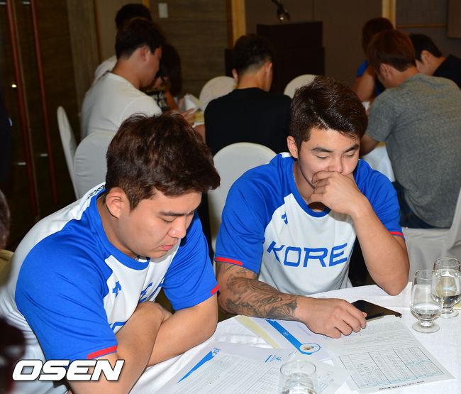 15일 오후 서울 리베라호텔 15층 로즈홀에서 AG 야구대표팀 류중일 감독과 박병호 김광현이 기자회견을 가졌다. 기자회견 후 열린 AG 야구대표팀 소청교육에서 김민성과 오재원이 자료를 살피고 있다.