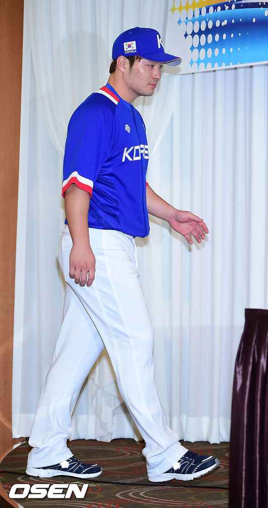 15일 오후 서울 리베라호텔 15층 로즈홀에서 AG 야구대표팀 류중일 감독과 박병호 김광현이 기자회견을 가졌다. 주장 박병호가 입장하고 있다.