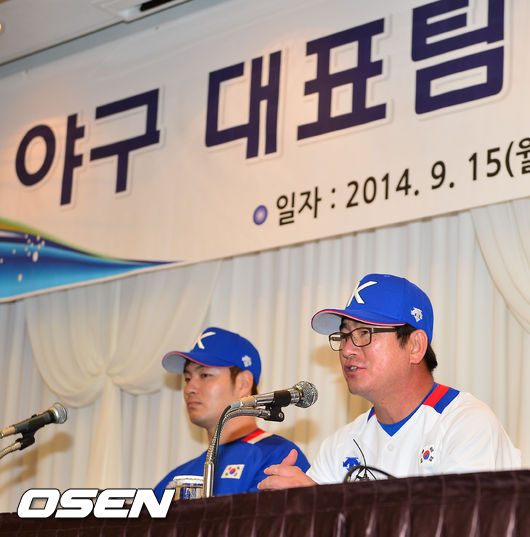 15일 오후 서울 리베라호텔 15층 로즈홀에서 AG 야구대표팀 류중일 감독과 박병호 김광현이 기자회견을 가졌다.