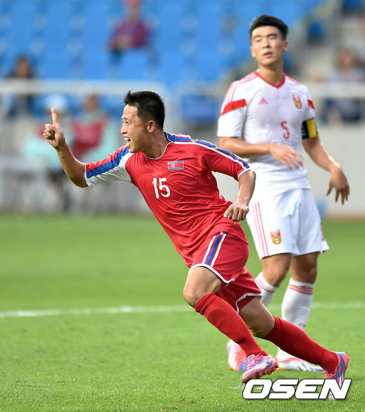 후반 북한 리혁철이 골을 성공시키고 환호하고 있다.
