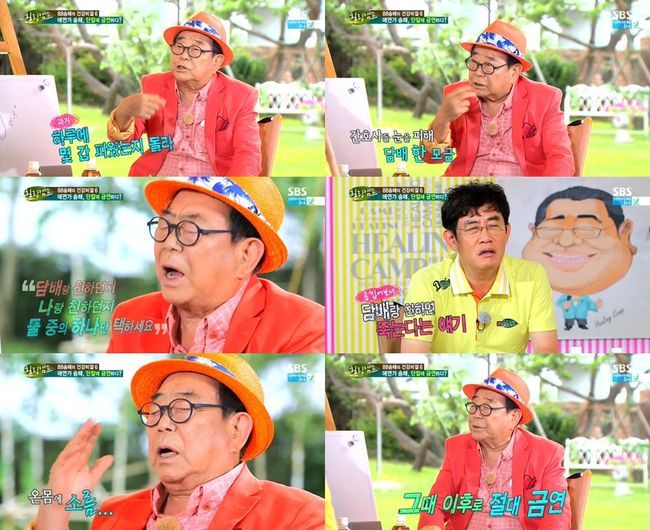 송해는 15일 오후 방송된 SBS '힐링캠프-기쁘지 아니한가(이하 '힐링캠프')'에서 "죽는다는 의사의 말에 바로 금연했다"고 밝혔다.